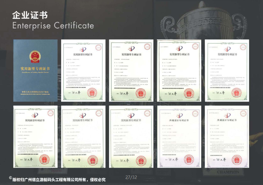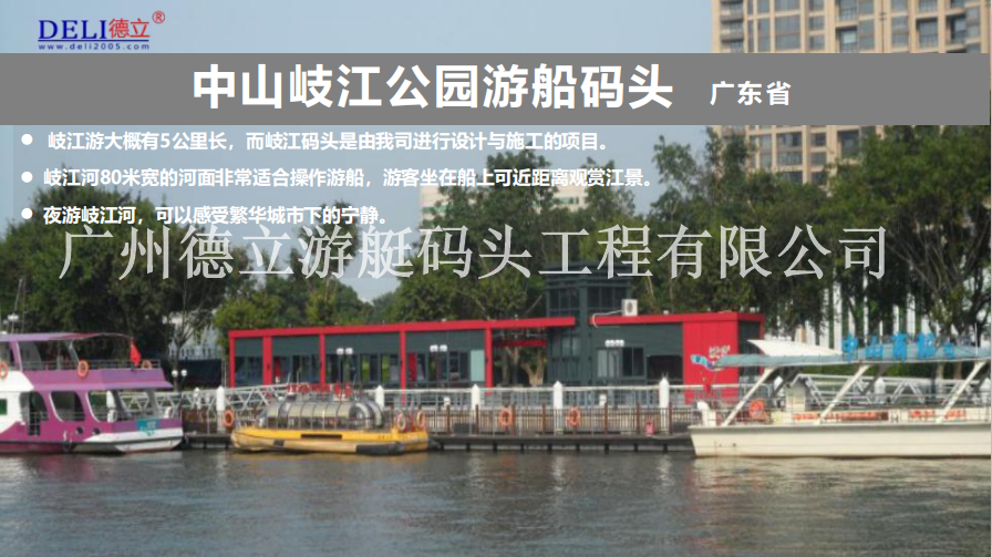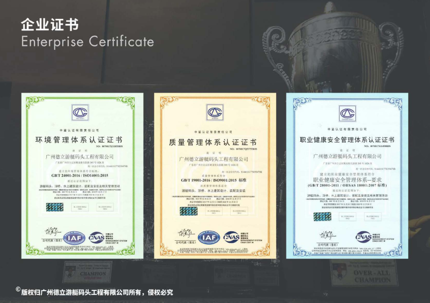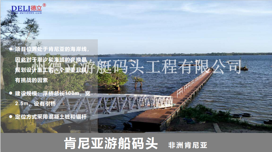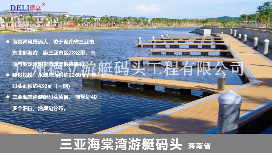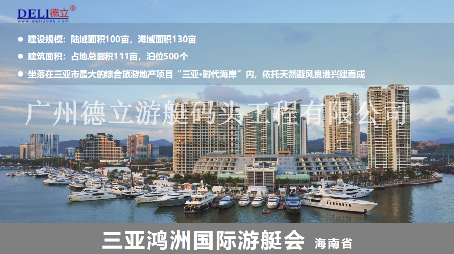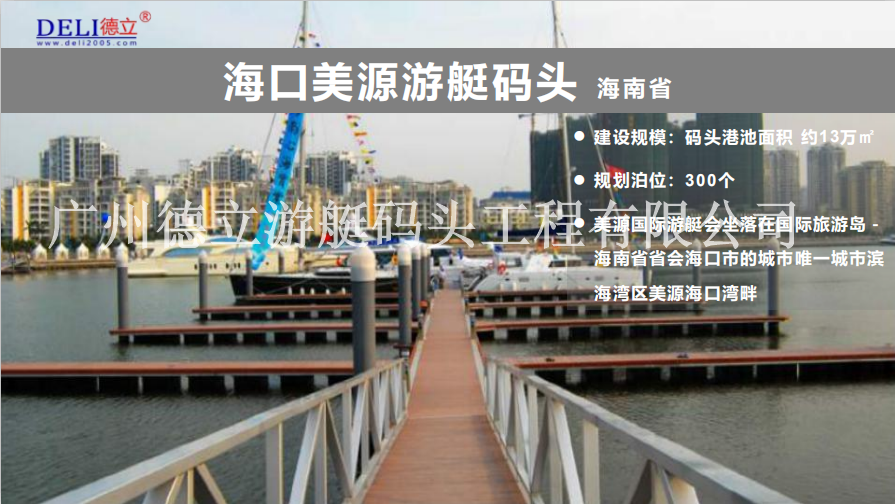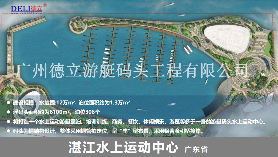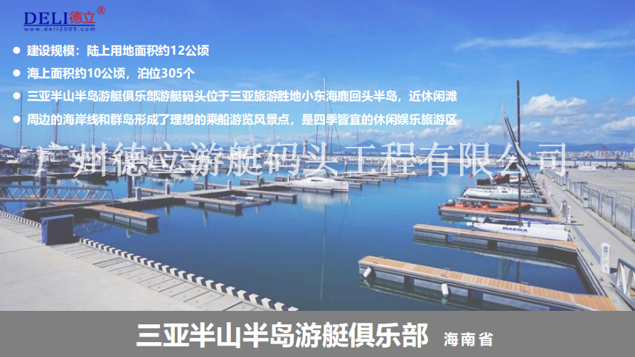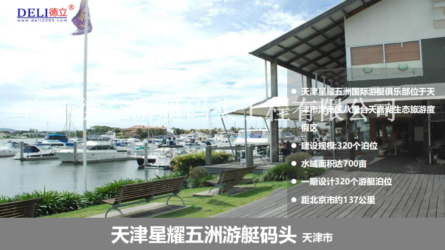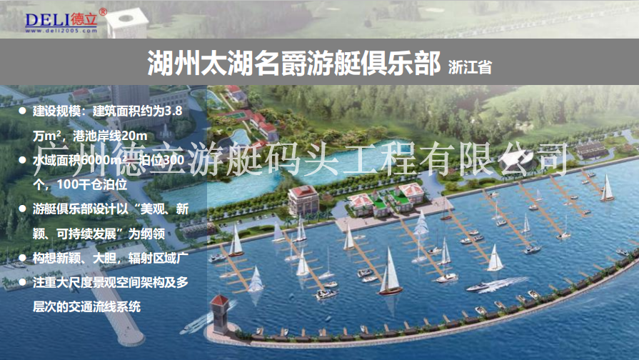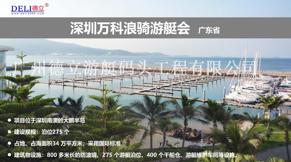 廣州德立游艇碼頭工程有限公司成立于2005年5月,是以游艇碼頭項目(游艇會、帆船港等)為核心,提供咨詢、規(guī)劃、設計、建造、投資、運營的綜合服務商;我司是國內首批正式注冊的游艇碼頭工程公司,主要從事游艇碼頭、浮橋、水上建筑等水上工程。服務內容包括工程項目的咨詢、設計、建造和管理,擁有相關技術知識產(chǎn)權,2013年,德立參與起草《游艇碼頭浮橋結構制作安裝與檢驗標準》,是國內第一家起草游艇碼頭技術標準企業(yè)。是行業(yè)內的資深高新技術企業(yè),見證了游艇碼頭產(chǎn)業(yè)在中國的起步、發(fā)展,并參與了國內多個重點項目的開發(fā)、建設、運營。