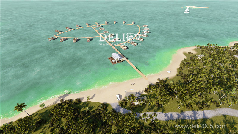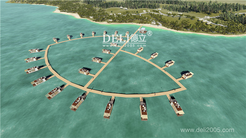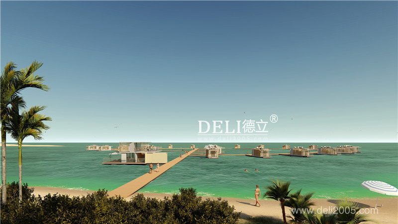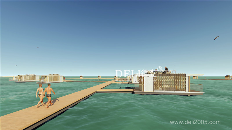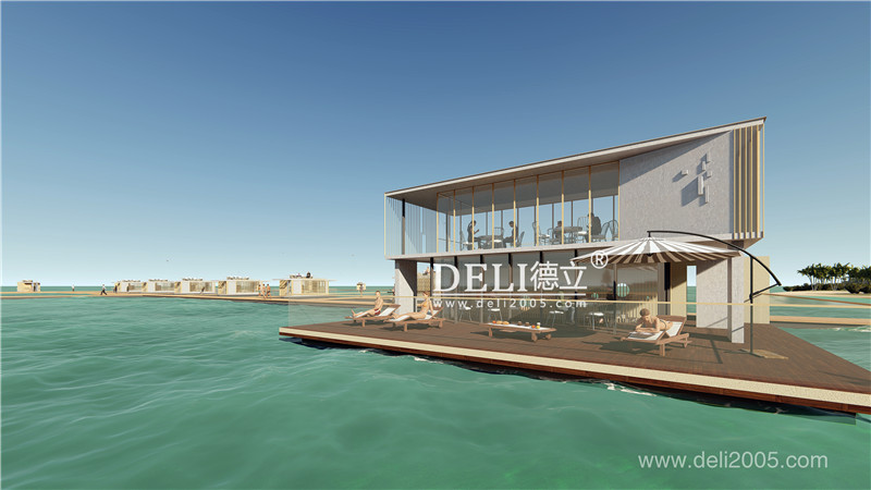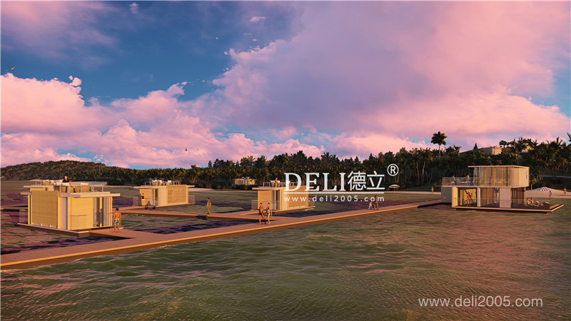 建筑采用的是輕鋼結(jié)構(gòu),從而降低重量,便于運(yùn)輸與裝卸。由于是裝配式建筑,在建筑整體的造型上,采用的是趨于規(guī)整的對(duì)稱體塊,既保證了空間利用率也可以提升居住空間的舒適感。整體設(shè)計(jì)風(fēng)格主要以時(shí)尚簡約風(fēng)格為主,考慮到是水上建筑,因此在材料的選擇上,運(yùn)用的是木材,木元素與水元素兩種自然元素結(jié)合,更加貼近自然。建筑的兩側(cè)用玻璃幕墻代替了傳統(tǒng)的墻體,玻璃的運(yùn)用可以最大限度的采光,室內(nèi)空間通透明亮,在視覺上可以給人一種寬敞的感覺。在玻璃幕墻的外圍,采用木制欄桿圍繞著,這樣的設(shè)計(jì)第一可以保留一定的私密性,第二可以美化玻璃幕墻,既保證了建筑私密性,又保留了建筑需要的通透性。