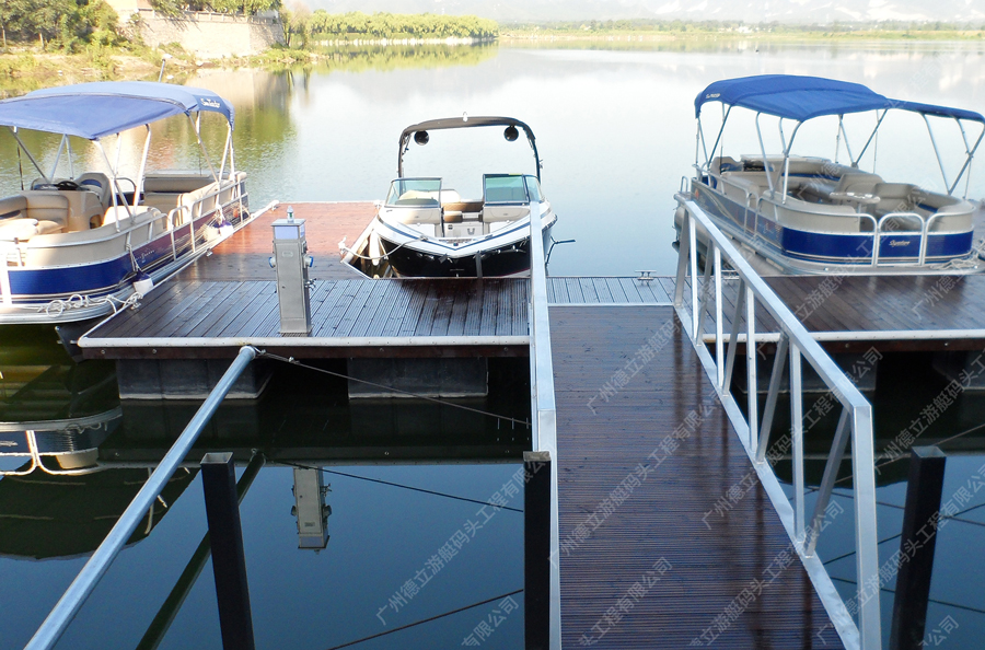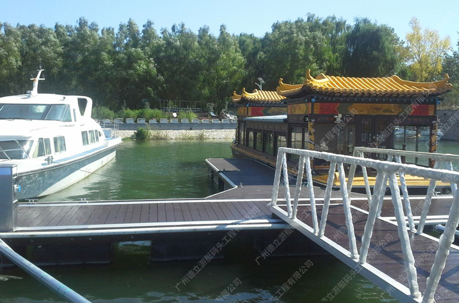 【項(xiàng)目介紹】北京青龍湖公園位于京郊豐臺(tái)區(qū)王佐鄉(xiāng),園內(nèi)山清水秀,林木茂盛,護(hù)面寬闊,生態(tài)環(huán)境十分優(yōu)美,被國家旅游局評(píng)為AAA級(jí)旅游景區(qū)。北京青龍湖游艇會(huì)所坐落其中,從會(huì)所延伸一固定棧橋,棧橋兩側(cè)布置浮碼頭。為平衡開闊而平靜的湖面與浮碼頭構(gòu)筑物高度差之間的景觀效果,浮碼頭的固定選用撐桿、拋錨等低位固定方式進(jìn)行處理,最終使浮碼頭置于會(huì)所與青龍湖之間而不顯突兀,成為景區(qū)中的有一道風(fēng)景線。