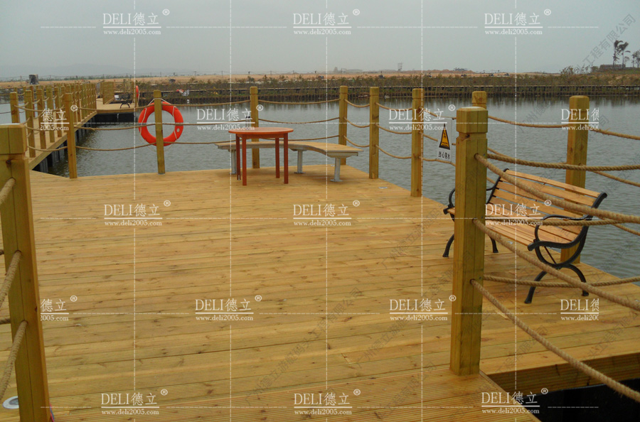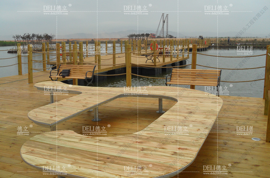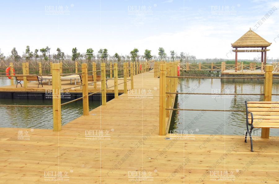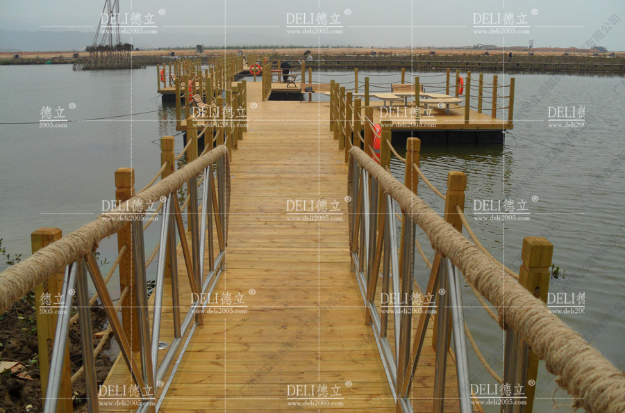 珠海橫琴浮橋長120米,項目從設計到施工,12天內完成,創(chuàng)下行業(yè)內新 速度,德立這一壯舉是堅持自主創(chuàng)新、自主知識產權的獨具風格,該橋的設計主要是采用鋼結構受力件、防腐木板及PE塑料浮箱等材料制作而成,設計受載300公斤 / 每平方米,最大落差 2.0 米 ,浮橋兩側設有水上平臺可供游客觀賞及休息,全面體現了設計的人性化及完美度。