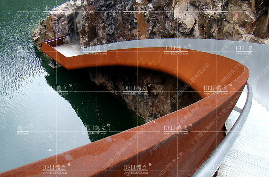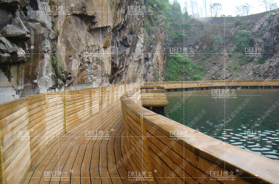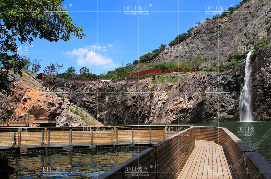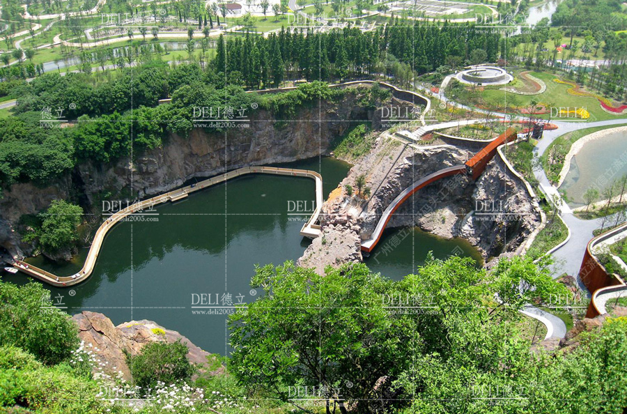 辰山礦坑花園景觀浮橋位于上海植物園西北角,通過綠環(huán)道路和辰山河邊主路與整個植物園相連。景觀浮橋是礦坑花園的主要通道,全長約160米,寬1.6米,整座浮橋采用模塊結(jié)構(gòu),由特制浮箱、鋼結(jié)構(gòu)和進口防腐木面板組成。浮橋緊帖在低于地平面30米的水平面上,行走在上面宛如走在水面上,此時身邊的峭壁恍惚要倒塌,加上浮橋的小小的搖搖晃晃感覺,別具匠心,站在這座沉床式花園浮橋中間,峭壁環(huán)生,瀑布飛泄,加上水杉林遮住了陽光,此刻恍如絕境。走完浮橋是個黑乎乎的山洞,鉆過山洞再見天日,不禁感嘆礦坑花園的神奇。