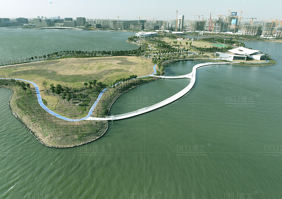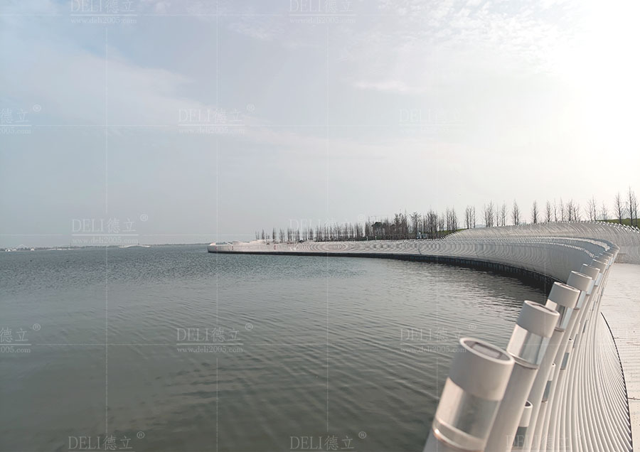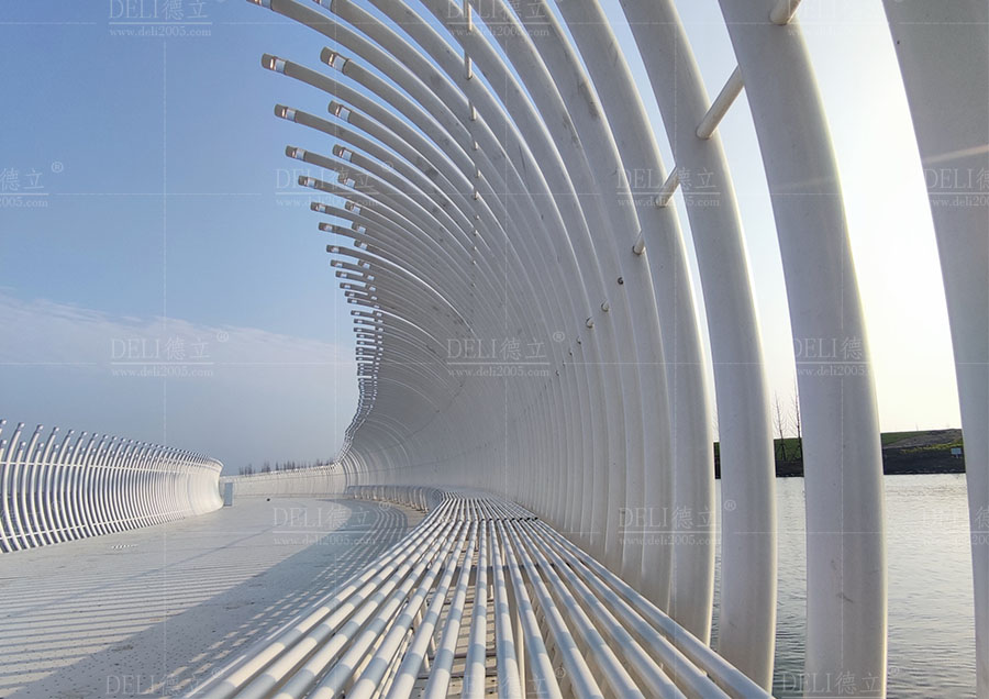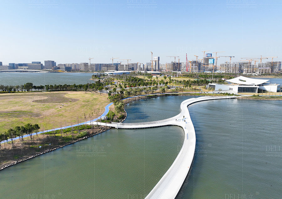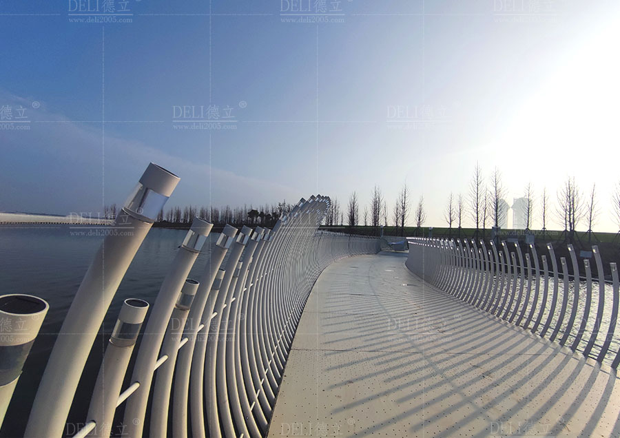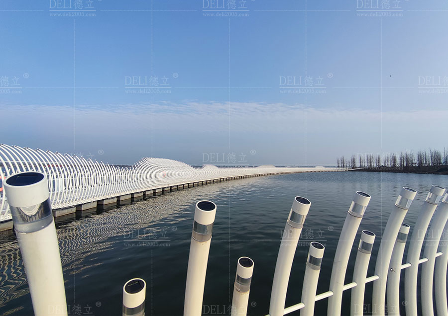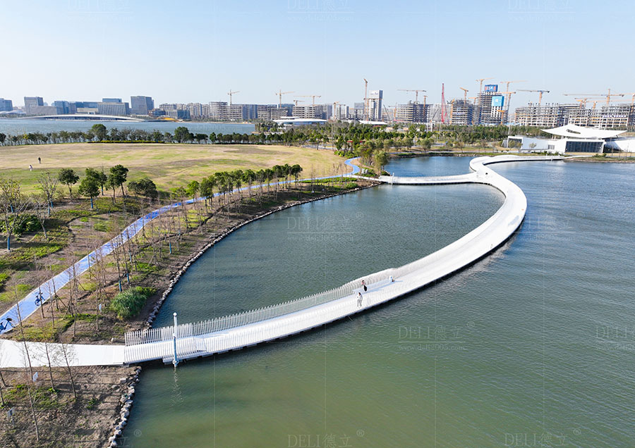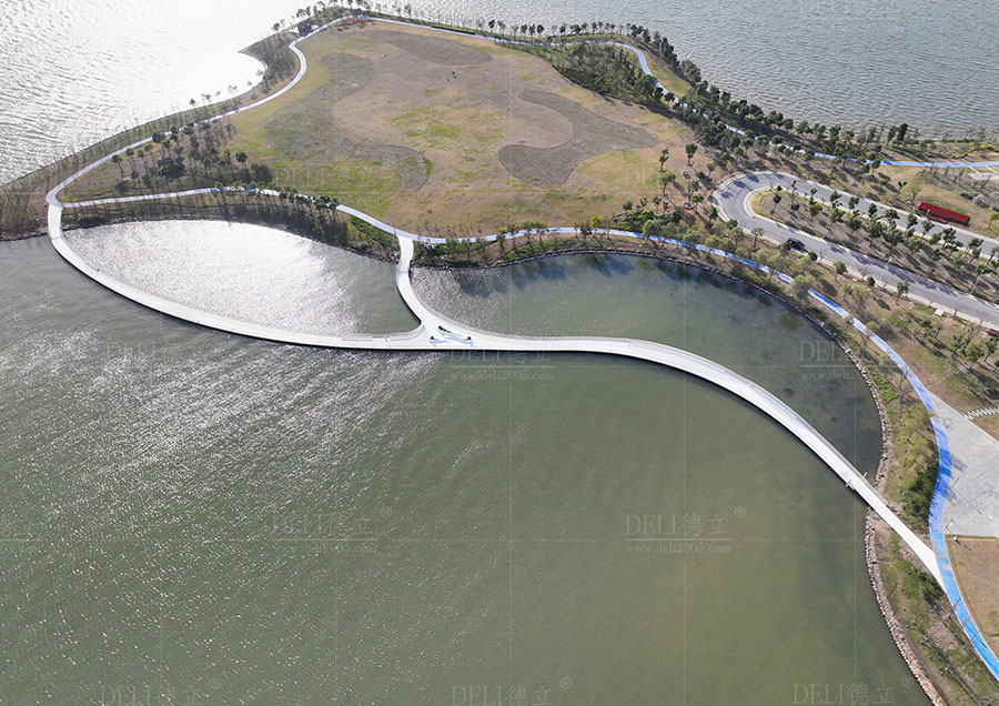 【介紹】浮橋整體采用了干凈、簡(jiǎn)潔的全白色調(diào),白色的浮橋在陽(yáng)光的照射下越發(fā)的清新、和諧、耀眼,使得浮橋融入了自然環(huán)境中,也讓整座浮橋顯現(xiàn)出潔白無(wú)暇的質(zhì)感。 浮橋全長(zhǎng)約285m,總面積約1200㎡,浮橋平面造型采用了寬度漸變的曲線造型,浮橋沿湖面線漸變以達(dá)到與湖景相融合的效果,浮橋最寬處為5米,最小寬度為3米,利用了曲線的流暢弧度,展現(xiàn)了浮橋柔和感和流動(dòng)性的形態(tài)。 浮橋兩側(cè)設(shè)置了異形藝術(shù)造型欄桿,欄桿的設(shè)計(jì)不僅注重了造型的美感和藝術(shù)感,更重要的是考慮到欄桿的實(shí)用功能。結(jié)合了實(shí)際需求和使用場(chǎng)景,合理安排了欄桿的高度、形狀,保證其安全性和舒適度,為浮橋增添了藝術(shù)的魅力,展現(xiàn)出獨(dú)特的個(gè)性和氣質(zhì)。