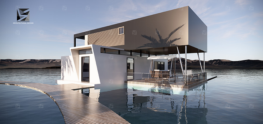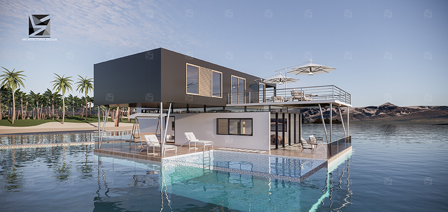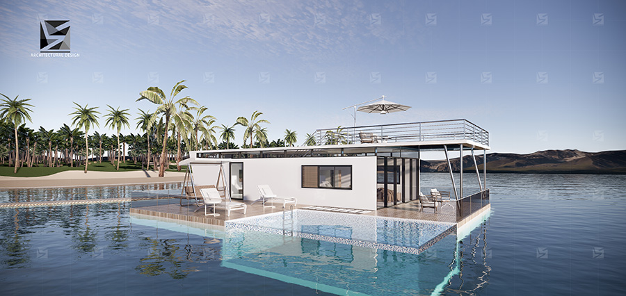 水上酒店配備最新低能耗建筑生態(tài)系統(tǒng),并設置了廚房、衛(wèi)生間、大床房、書房、戶外露臺、戶外泳池等功能空間。(也可更具市場需求進行,拼裝)