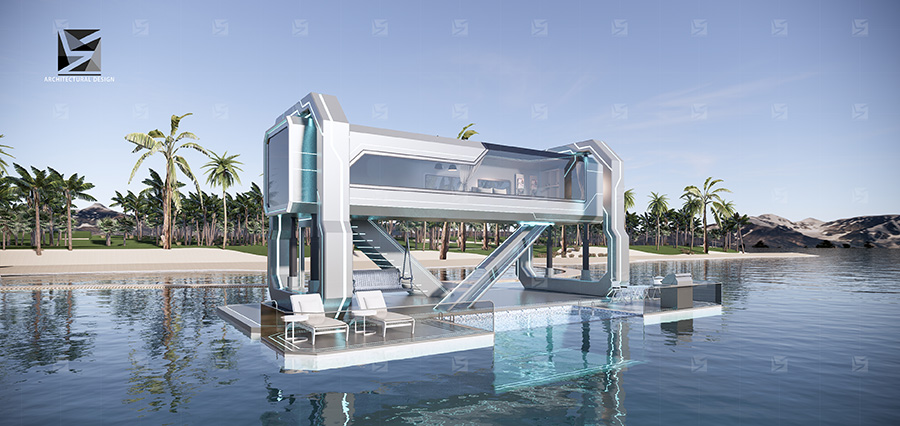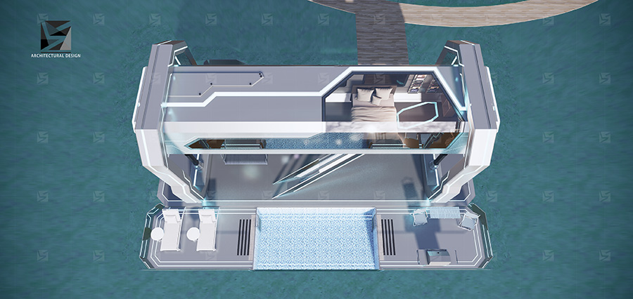 水上太空艙建筑配備最新低能耗建筑生態(tài)系統(tǒng),并設置了廚房、衛(wèi)生間、大床房、戶外露臺、戶外泳池、戶外燒烤等功能空間。