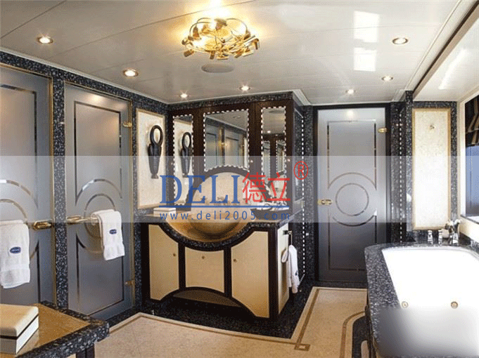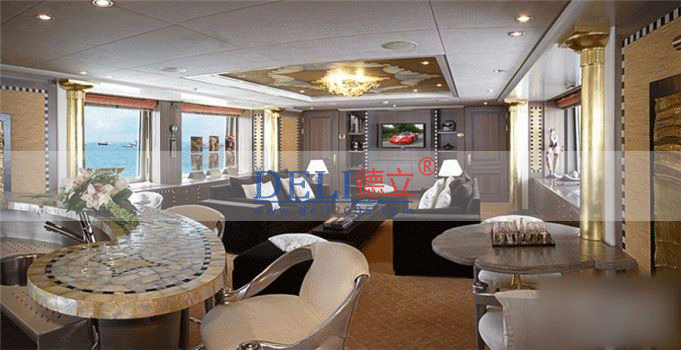 內(nèi)部客廳奢華時(shí)尚,兩側(cè)是大面積舷窗提供充足的采光,中央放有舒適的沙發(fā),造型奇特的茶幾增添一絲藝術(shù)的氣息。主臥寬敞舒適,放有一張大床,旁邊有儲(chǔ)物柜。