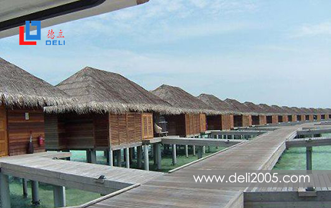 木屋依靠鋼筋混泥土樁固定在水面上,整體采用斜頂?shù)臉邮揭约霸鷳B(tài)的草屋頂。