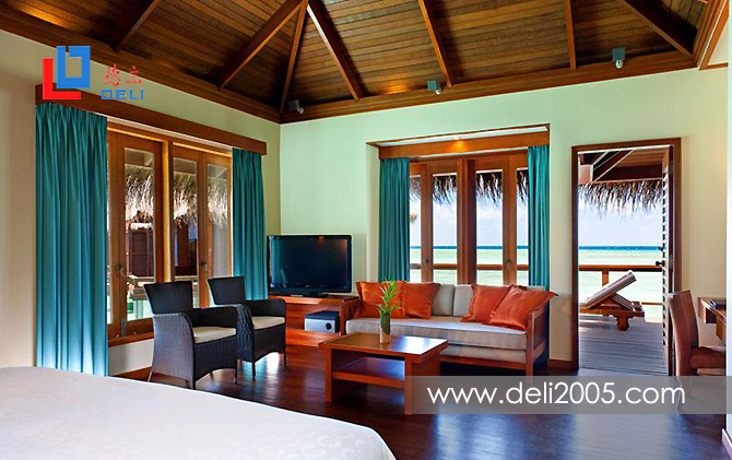 木屋外觀很漂亮,內(nèi)部裝飾也很有特點(diǎn)。室內(nèi)裝修都用木頭制作,臥具、書桌等都是用柚木特制的。臥室二面都是玻璃墻,使人有一種漂浮在大海上的感覺。在房間休息時(shí)你不用擔(dān)心海浪會吵醒你,因?yàn)榉块g密封很嚴(yán),基本上聽不到外邊的聲音。當(dāng)然,如果想要伴著海浪入眠,就可開窗睡了。
