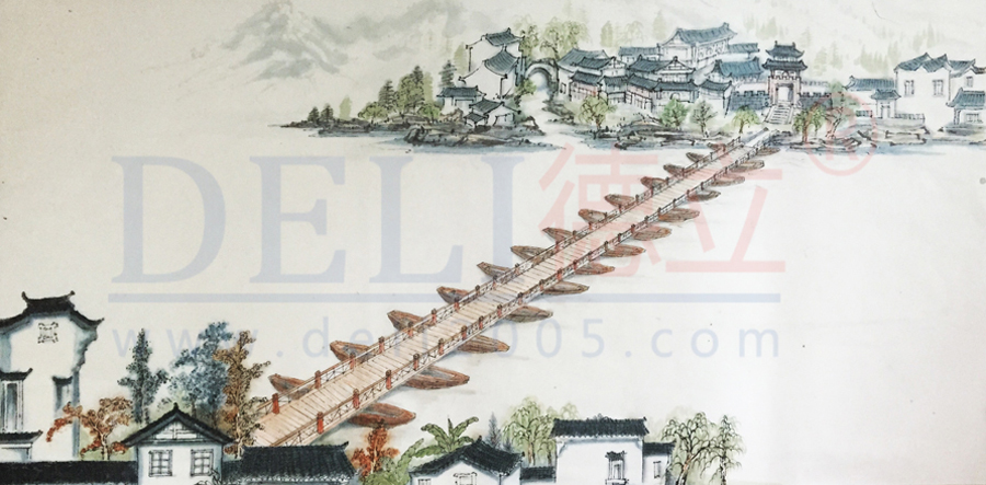 古浮橋是用不同造型的舟船作為它的主要浮體結(jié)構(gòu),然后用纜繩或鐵鏈把它們連接固定起來,舟船與舟船之間用木板相連接,以纖繩或鐵鏈作為欄桿,最后用鋼纜、鐵錨的形式把它們固定在江面之上。