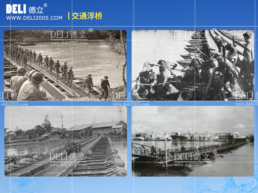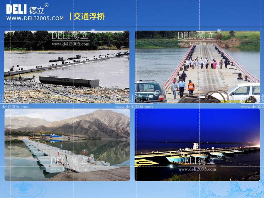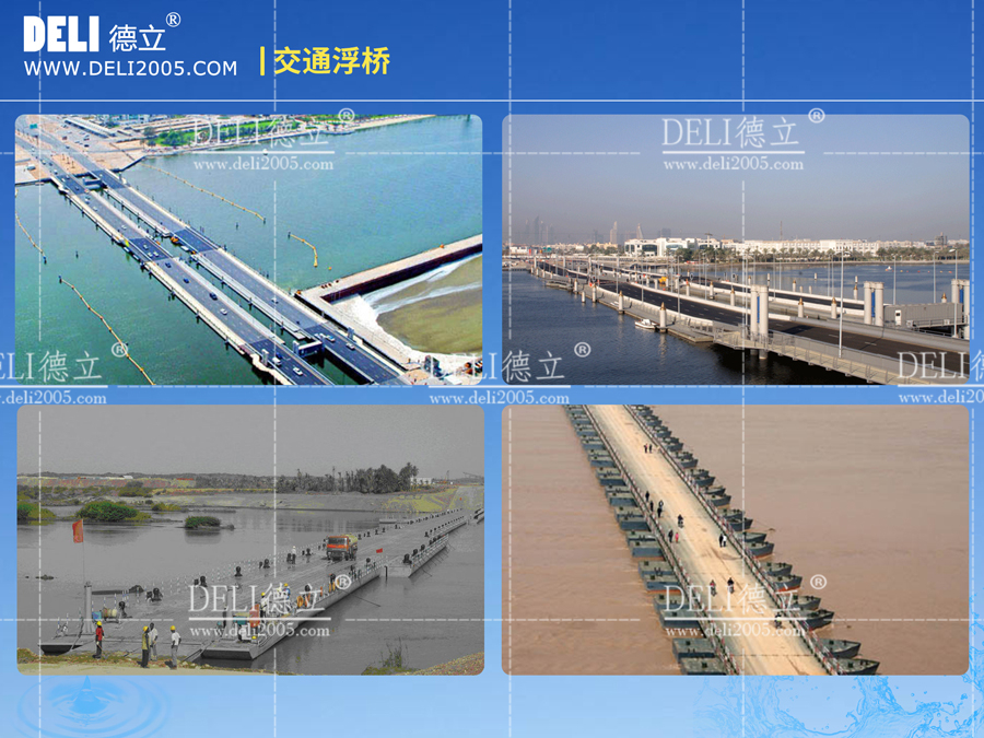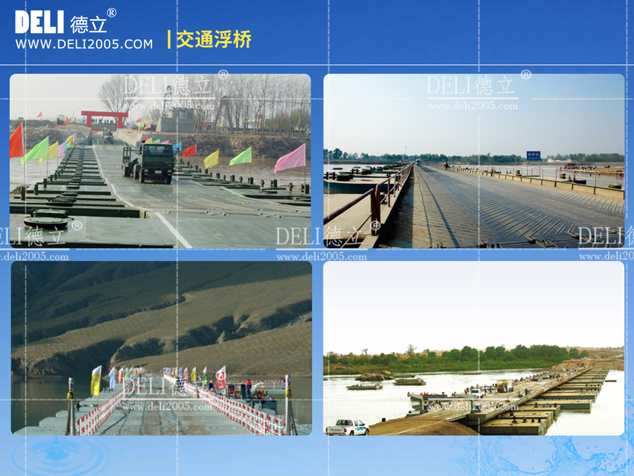 交通浮橋只要是由若干個(gè)具有良好通用性和互換性的單元模塊化的承壓舟組成,根據(jù)不同的需求,配置必要的專(zhuān)用設(shè)備或工具后,廣泛運(yùn)用于交通保障、水上工程施工和特殊工程等領(lǐng)域,特別適合交通不便地區(qū)和淺水區(qū)域。浮橋架設(shè)簡(jiǎn)便,成橋迅速,整體采用模塊化技術(shù),機(jī)動(dòng)性強(qiáng),構(gòu)造并不復(fù)雜,架拆也方便,但維修費(fèi)用高。浮橋可用于人行、公路、鐵路。