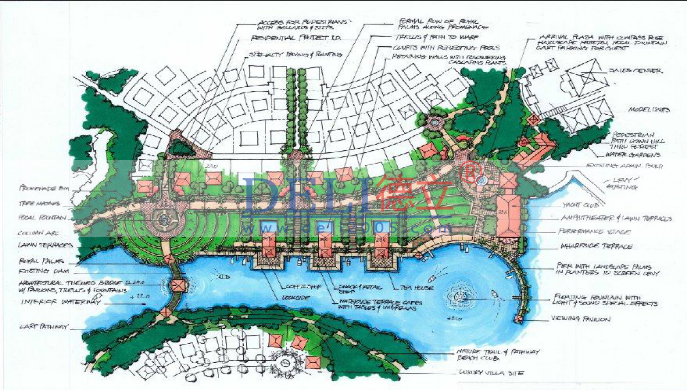 將碼頭各個組成部分看成一個建筑組群來對待,從整體上進行把握,可以結合游人等候設置一內(nèi)庭空間,在其中布置一些能夠體現(xiàn)建筑性格和水有關的雕塑、壁畫、汀步、置石、隔斷等園林建筑小品,應盡可能和水有關系以便進行點題,同時應該注意,從碼頭選址開始,就應注意借景、對景、觀景的考慮,使碼頭即可觀景又可成景,以便和整體環(huán)境相協(xié)調(diào)。