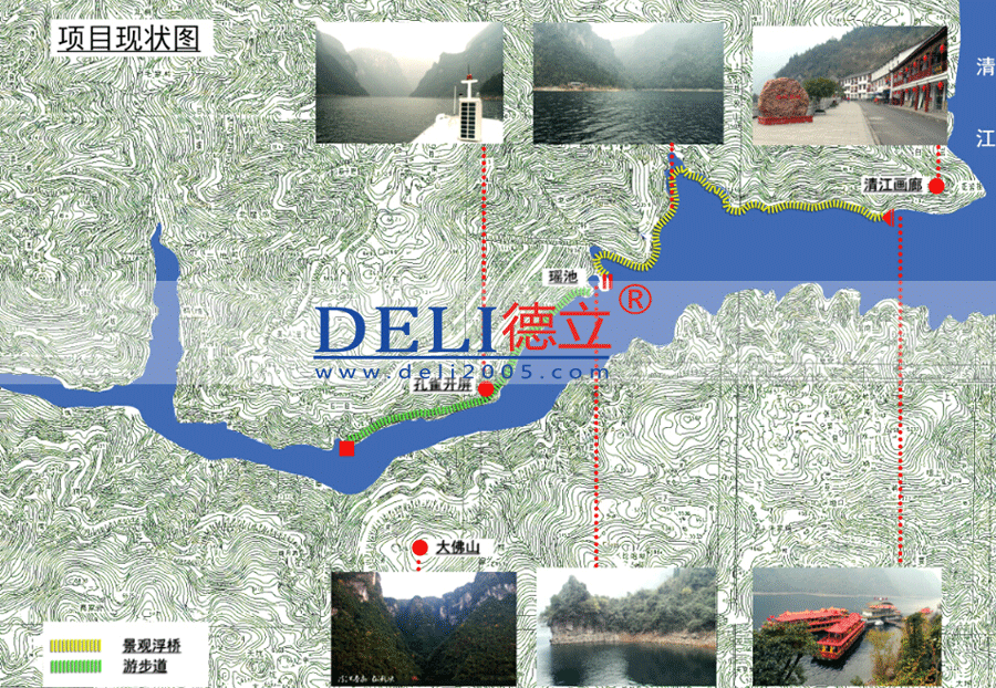 清江畫廊是國(guó)家AAAAA級(jí)景區(qū),位于宜昌的長(zhǎng)陽(yáng)土家族自治縣,本景觀浮橋項(xiàng)目為“清江畫廊”游船碼頭游覽線上的景觀延伸,屬于“清江畫廊”游船碼頭,距縣城水路約為11.4公里。本項(xiàng)目著重突出“觀水、親水、戲水”等水上活動(dòng)。地貌則屬于喀斯特地貌,河床坡度大,沿岸處水深;又為庫(kù)區(qū)水域,水位落差較大,故本項(xiàng)目的親水走廊宜采用浮橋形式。