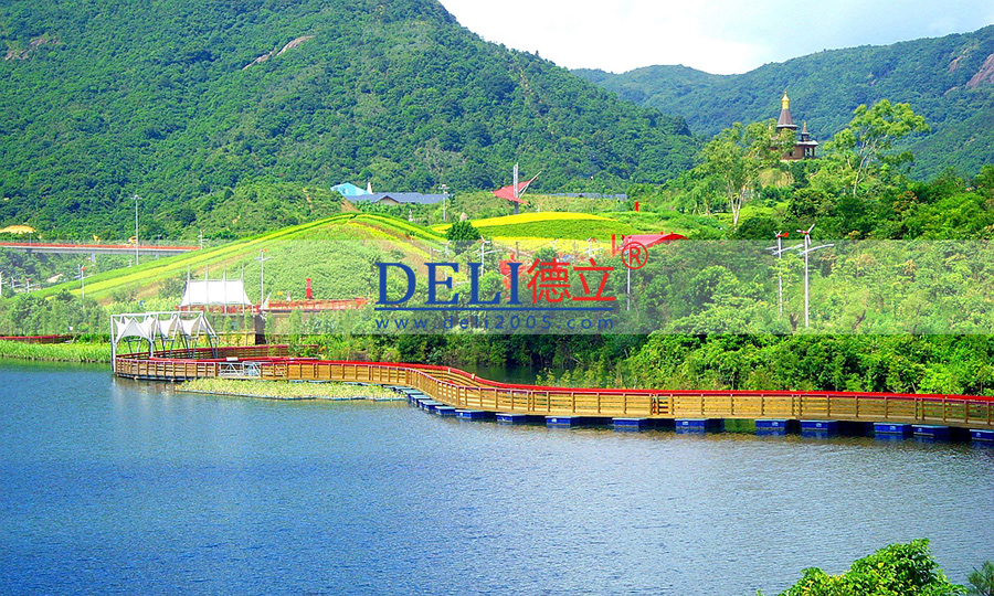 東部華僑城坐落于中國深圳大梅沙,占地近9平方公里,是以“讓都市人回歸自然”為宗旨,以文化旅游為特色的生態(tài)旅游示范區(qū),集生態(tài)動(dòng)感、休閑度假、戶外運(yùn)動(dòng)等多項(xiàng)文化旅游功能于一體,體現(xiàn)了人與自然的和諧共處。“茶溪谷”濕地公園浮橋,也是目前國內(nèi)最長的景觀浮橋,該工程設(shè)計(jì)最大荷載300公斤/平方米,水位落差2.0米,全長386米,寬3米,采用拋錨式固定。遠(yuǎn)處望去,它猶如一條巨龍蜿蜒于兩岸之間,盤旋環(huán)繞,指引著你進(jìn)入一個(gè)童話般的世界!佇立浮橋之上,頓生輕飄之感;欣賞獨(dú)有的湖光山色、方海奇觀、懸涯飛瀑;隔著欄桿,臨水遐思與眺望,那妙不可言的姿勢(shì),那種驚奇、快慰與滿足,至今追憶起來仍歷久彌新。 “茶溪谷”濕地公園浮橋?qū)е陨硖赜械漠惒?,成為東部華僑城一道令人嘆為觀止的亮麗風(fēng)景線。