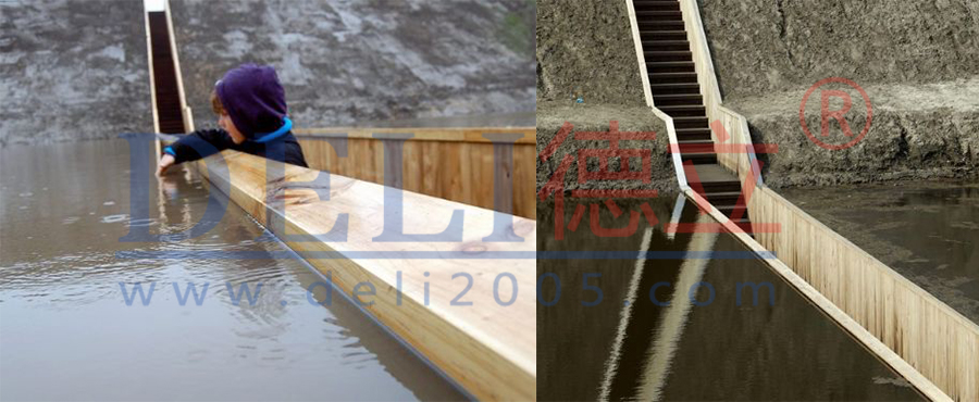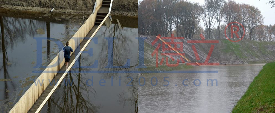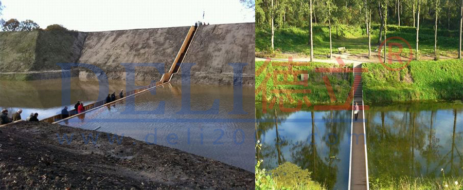近期該地區(qū)開始向游客開放,該區(qū)最大的堡壘Fort de Roovere需要建造一座供人通行人橋梁。堡壘被護(hù)城河環(huán)繞,之前并未修筑任何橋梁。為了不破壞城堡原來的面貌,設(shè)計(jì)師選擇了這種下沉式的設(shè)計(jì)。RO&AD的建筑師提出的解決方案是建造一座嵌在水面上的橋——摩西橋(Moses Bridge),凹陷的橋略高于水面,遠(yuǎn)處看去,橋的形象消失在人們眼中。人們從這座橋通過,就像是神話里行走在被劈開的水中,但實(shí)際上水流是連續(xù)的。(文字參考:yeskafei.com)