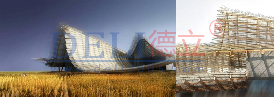 中國國家館: 竹編屋頂+模擬“稻田”。