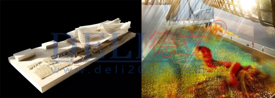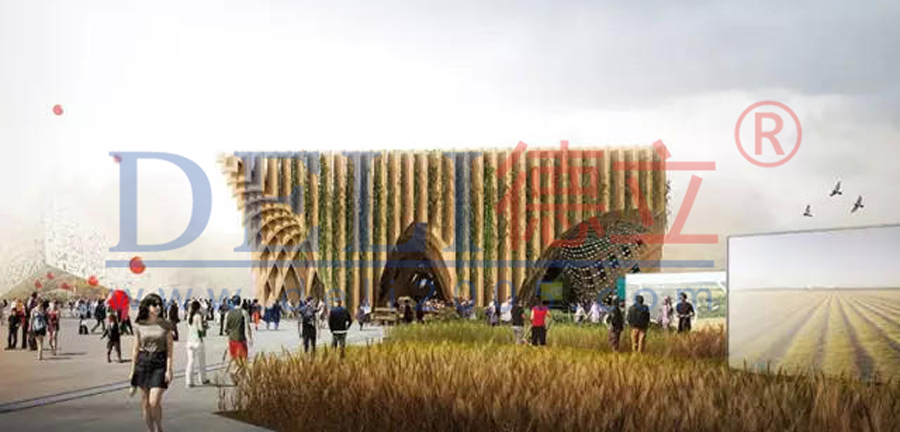 中國館主題為“希望的田野,生命的源泉”,場館建筑外形起伏蜿蜒,靈感源自田野上的“麥浪”,屋頂則采用竹編材質,通過傳統(tǒng)竹編工藝選擇不同的透光率,將自然采光引入室內,減低人工照明的能耗。而展陳設計包括五部分,主題分別為:序、天、人、地、和。另外場館周圍以及內部廣場以一根根LED枝干裝置覆蓋,逼真模擬稻田。