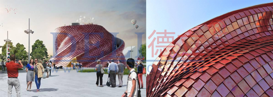 Libeskind,這位猶太裔建筑師以一系列博物館設計聞名。Libeskind賦予萬科場館鮮紅的彎曲外立面,4000塊紅色陶板沿著猶如盤龍般的建筑層疊旋轉而上,陶板在不同光線下可以變色,放似龍鱗。此外建筑本身盤旋的造型靈感也源自我們的山巒、梯田等象征景象。