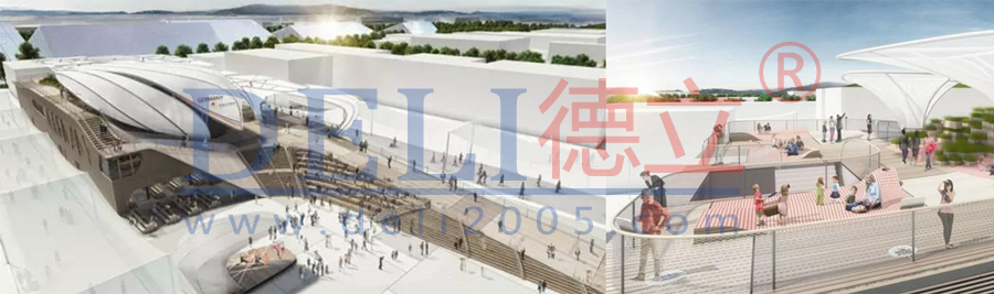 入口的坡道通往建筑的空中平臺,坡道采用各種色調的木材平鋪。德國館的西南角,一個“德國廣場”提供了一個聚集、表演、活動的場所。建筑首層的斜向階梯座位與餐廳,能容納350人。而主屋頂以白色弧形拉伸織物建構,可以遮陽,還連接了室內外空間。