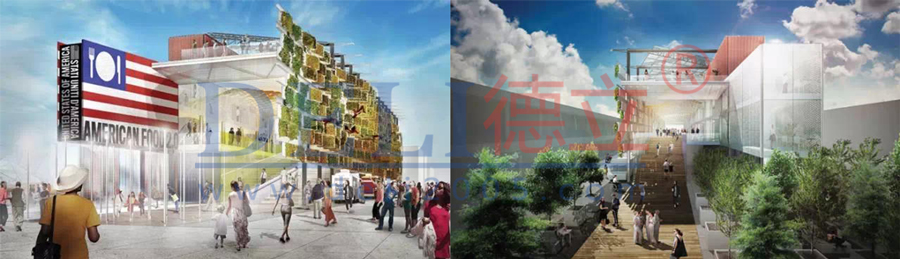 美國在今年世博的國家館,擁有一個靈感源自“谷倉”的建筑結構,由James Biber創(chuàng)立的建筑事務所擔綱總設計。展館以“食物”為主題,最明顯的是建筑物外部層疊的農作物——仿佛一個垂直農場,這些作物將以雨水系統(tǒng)進行澆水。