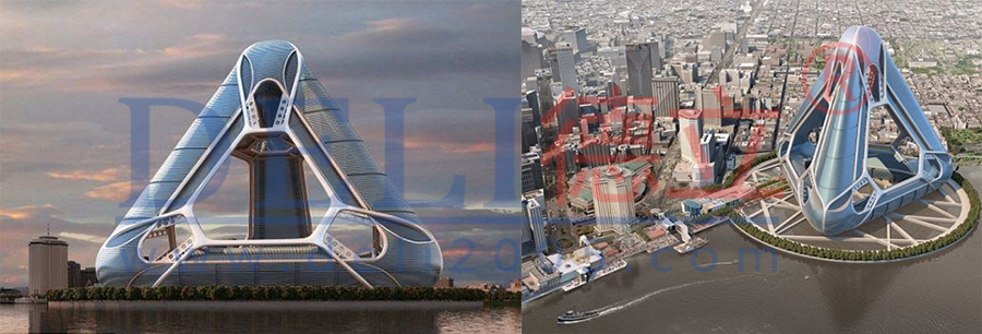 這座全新的漂浮城市將坐落在密西西比河岸,它能防止類似的自然災(zāi)難發(fā)生。其主體結(jié)構(gòu)是中空的,強(qiáng)風(fēng)能從中通過(guò)。其上安裝的颶風(fēng)板,可以確保把颶風(fēng)對(duì)建筑的破壞降至最低。