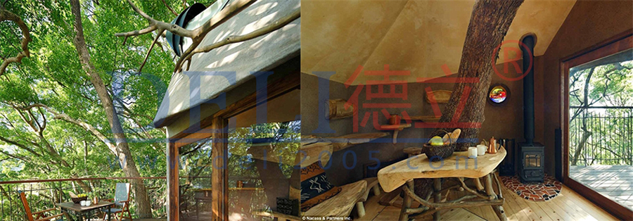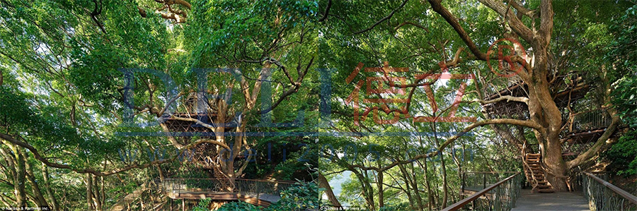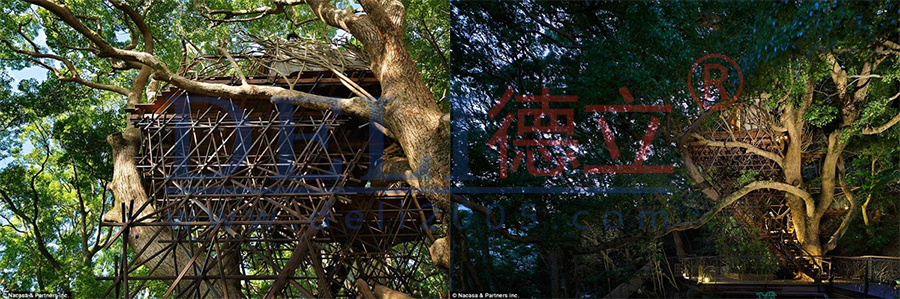 遠遠看去,這座樹屋坐落在一棵300年的樟樹之上,就像一個大鳥巢。但實際上是不接觸樹木的,而是用鋼架支撐,巧妙的躲過枝丫,既不會傷害樹木,也不會阻礙它繼續(xù)生長。樹上有一條長達36米的走廊,通向咖啡廳、野餐區(qū)和兒童游樂園。