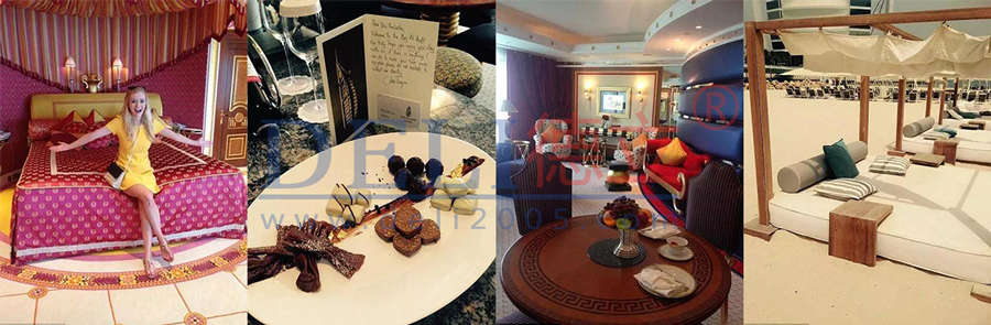 著名的迪拜帆船酒店,在迪拜的一個人工島上,對外一直宣稱是世界上唯一的七星級酒店。酒店標(biāo)配接待用車是白色的勞斯萊斯,一般會在酒店前一字排開,車旁邊站著西裝革履的司機(jī),他們隨時負(fù)責(zé)接著你。