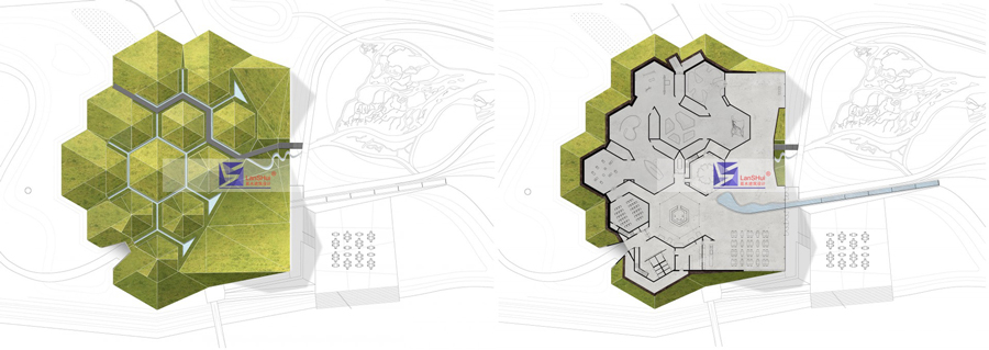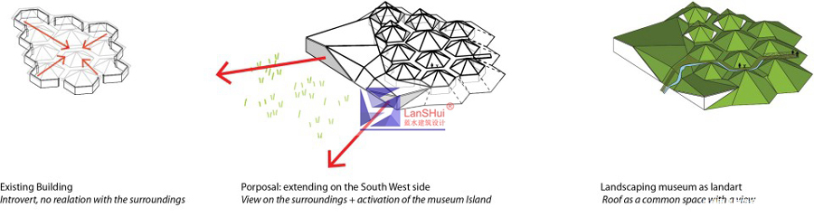 為了避免不必要的材料和能源浪費,老博物館六邊形的結(jié)構(gòu)被保留,且在它的西南部,加蓋了一座1000平米的新建筑。新建筑以其大面積的開窗為特征,面向島上的花園開放。其中包含一家可以欣賞周圍美景的有機餐廳,以及臨時展覽空間。