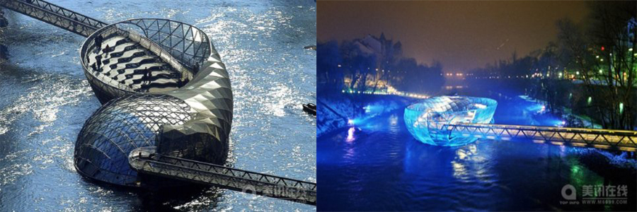 由紐約當(dāng)代藝術(shù)建筑師Vito Acconci所設(shè)計(jì),是一座位于河中央的水上劇場,它是格拉茲成為2003歐洲文化之都其中一個(gè)項(xiàng)目。格拉茲位于阿爾卑斯山南,是奧地利的第二大城市,建于15世紀(jì),部分地區(qū)至今仍保有中古世紀(jì)風(fēng)貌,并于1999年成為聯(lián)合國教科文組織指定之世界文化遺產(chǎn)城市。格拉茲的城市風(fēng)貌兼具了古典的優(yōu)雅和現(xiàn)代的時(shí)尚,也因此Acconci將這座既夢幻又實(shí)際的前衛(wèi)建筑置入其中,不但不顯得突兀,還頗為貼切。
