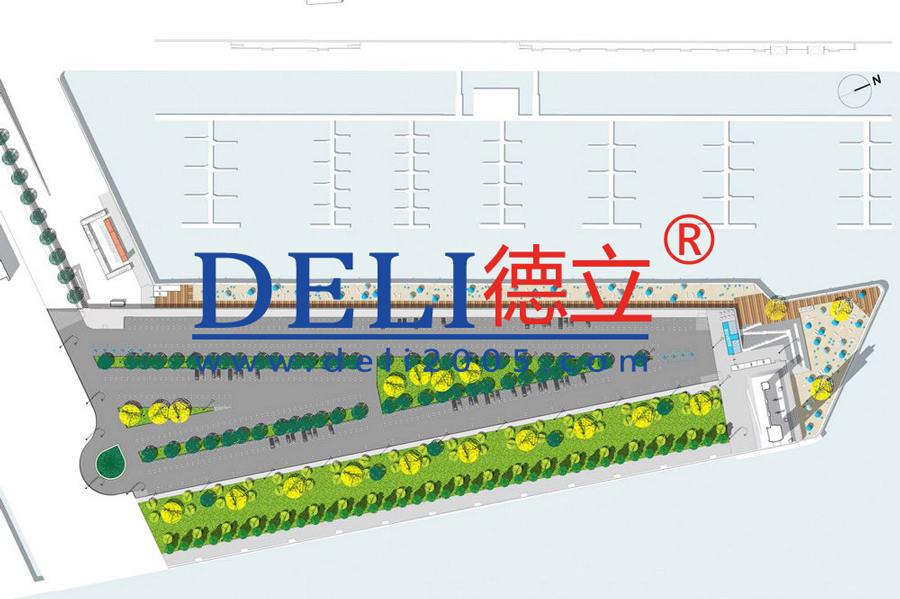 更讓人耳目一新的是優(yōu)雅的藍(lán)色沙灘傘、垂柳,色彩鮮艷的椅子和裝置、淋浴、木板路、柔滑的砂和點(diǎn)心站,給游客一個(gè)純粹的懶惰時(shí)刻。第二部分是停車場(chǎng),由一排樹組成,清晰再現(xiàn)了碼頭的三角形布局。由地表水徑流、落葉松、柳樹、灌木和多年生植被,增加綠色空間的氣氛。