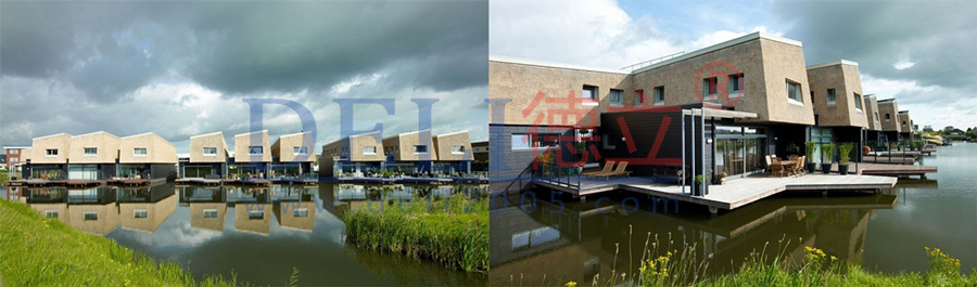 荷蘭鹿特丹城市景觀的城市規(guī)劃擬在湖面上建造一共三組住宅,項目名稱“水上九住房”,每個住宅175平方米,平均一個屋頂下可以建造三個住宅,也就是以屋頂為單元,三三一組形成建造格局,三組住宅由水道分開。這些住宅位于堤壩之上,是該地區(qū)的標志性建筑之一。住宅與水的關(guān)系給家庭生活帶來一種特殊的氛圍。建筑師還減少了起居室的面積,增加了樓層高度,讓人們在這里有盡可能多的空間體驗。