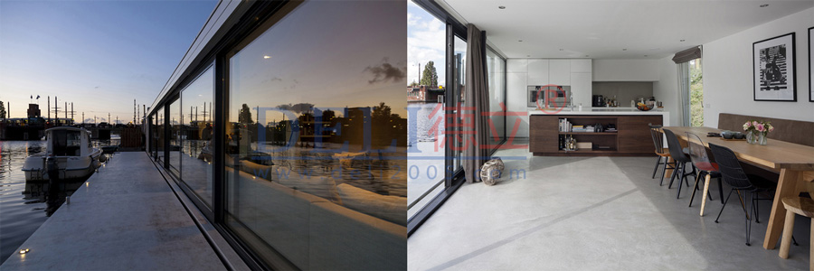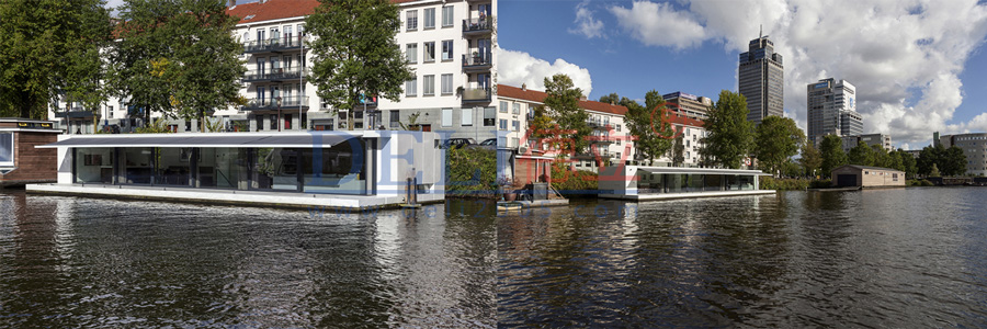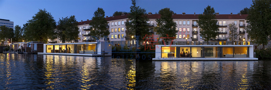 +31建筑事務(wù)所在阿姆斯特丹的阿姆斯特爾河畔設(shè)計(jì)完成了一座水上別墅。臨河住宅的數(shù)目日益增多,不僅是因?yàn)槠涞锰飒?dú)厚的地理位置,更因?yàn)檫@樣做能夠有效保護(hù)土地,抵抗洪水。由于水上別墅能與碼頭靈活銜接,其浮力結(jié)構(gòu)可以根據(jù)潮汐的改變來調(diào)整其在水中上升的高度。該住宅的形式是一個(gè)中空的混凝土體量和一座實(shí)體浮橋,這樣可以使建筑本身比水還輕。水上別墅的特點(diǎn)是它的“長”,長方形的建筑上安裝有穿孔的玻璃外墻,能給人一種度假的感覺。