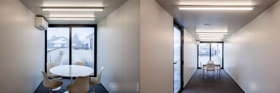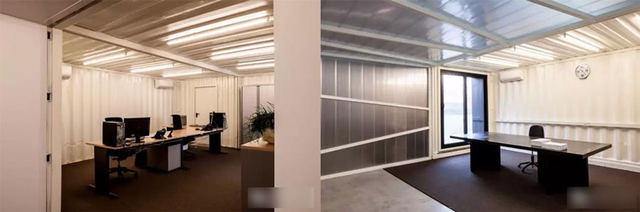 Drukta 辦公室運用多元化的材質(zhì)營造出溫暖與舒適的氛圍。Formail 則追求極簡主義風(fēng)格,直接將集裝箱內(nèi)壁漆成白色。除了視覺形象外,功能性也尤為重要,集裝箱突出戶外的部分進行了保溫處理。Five AM 的照明方案是規(guī)律的排布日光燈。