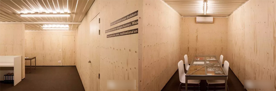 集裝箱并不是被全部放置于倉庫內(nèi)部,它們的一部分延伸到建筑之外,例如突出外墻0.5米的 Drukta 辦公室入口以及 Formail 所使用的倉庫原有裝卸區(qū)域。這樣規(guī)劃的優(yōu)點在于能將自然光引入建筑內(nèi)部,并讓集裝箱為倉庫外表面增加標(biāo)志性元素。