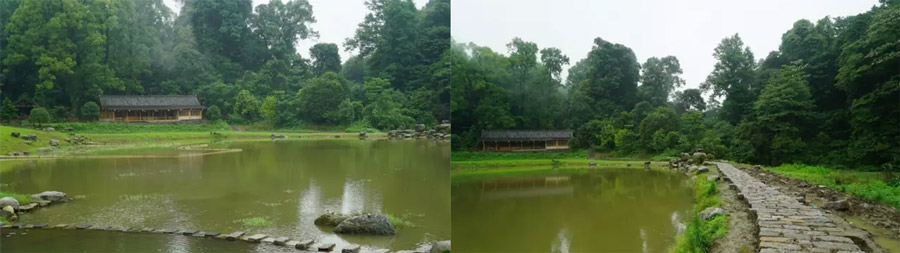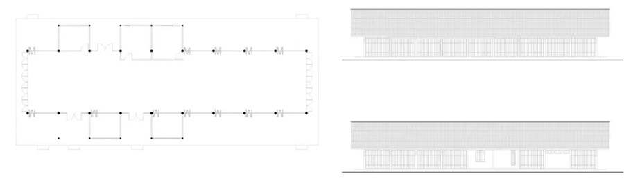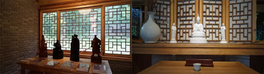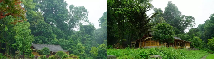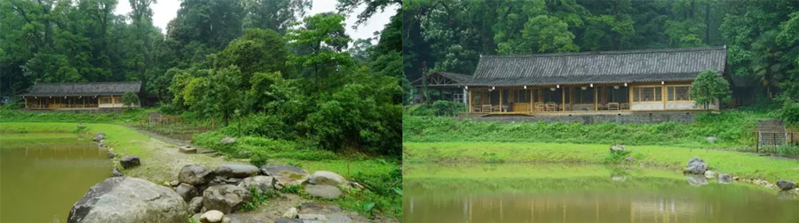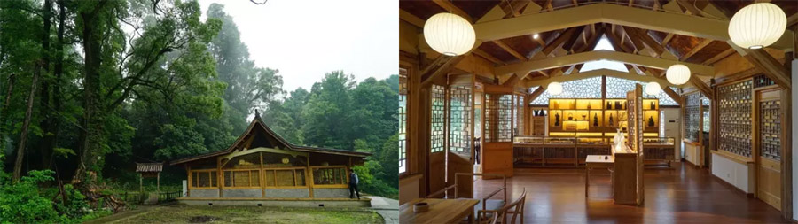 洞山寺茶室正是為寺廟以茶待客而修建的。洞山茶室設(shè)計的初衷就是一間停于山水之間的木屋。此案使用了一種新的木結(jié)構(gòu)形式,簡化、高舉了屋架。通過屋頂木構(gòu)件的交叉和貫通,將傳統(tǒng)屋架的舉折轉(zhuǎn)化為構(gòu)件交叉處的轉(zhuǎn)折。使屋架構(gòu)件的數(shù)量減少,用料減小,內(nèi)部空間更加通透完整,屋頂立面更高聳挺拔,同時保持了與傳統(tǒng)屋頂形式相通的意象。傳統(tǒng)屋頂?shù)膾佄锞€曲線轉(zhuǎn)化為了更干脆利落的折線,也暗合了禪宗不立文字、直指人心的思想。