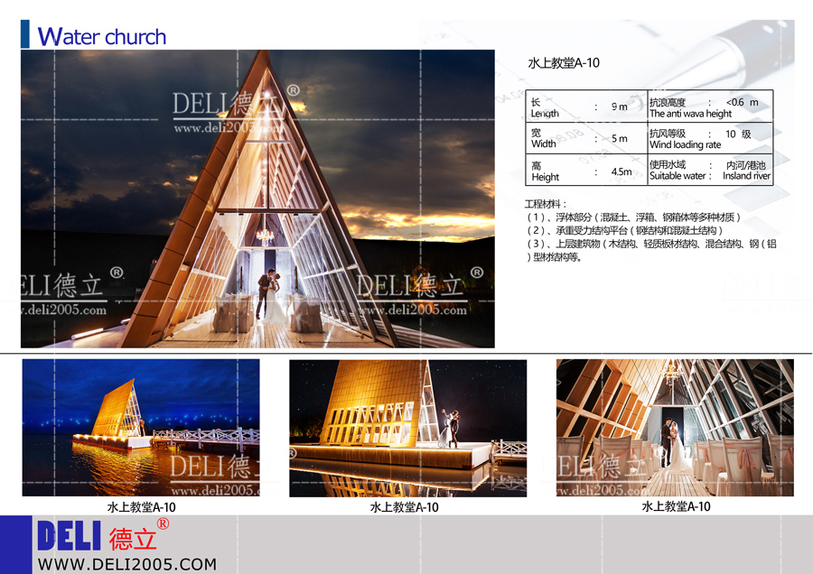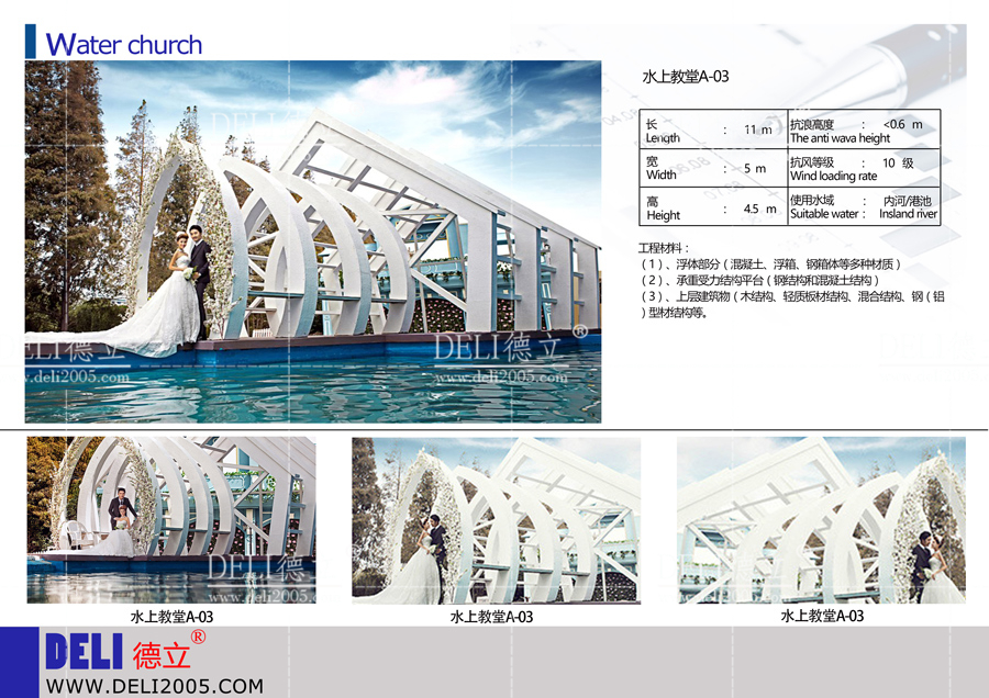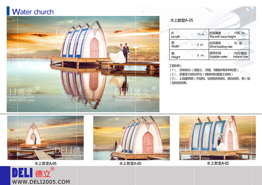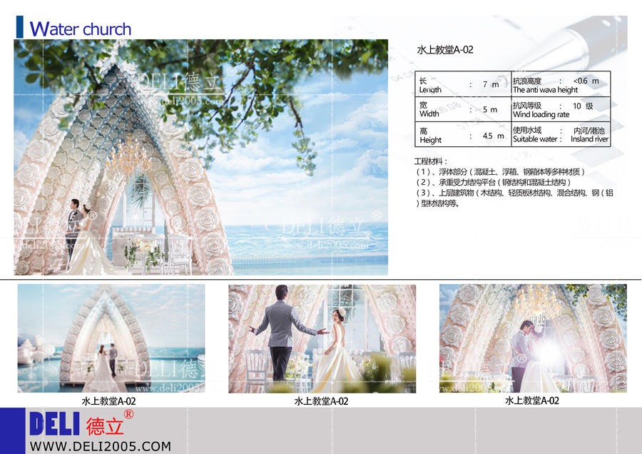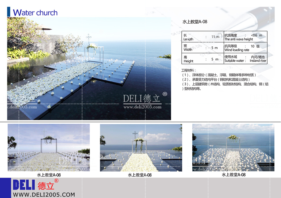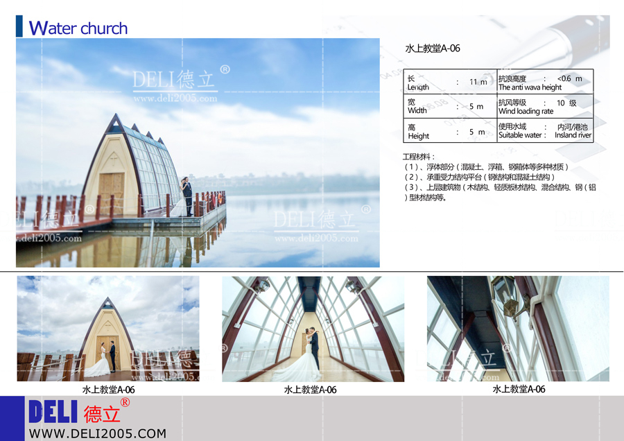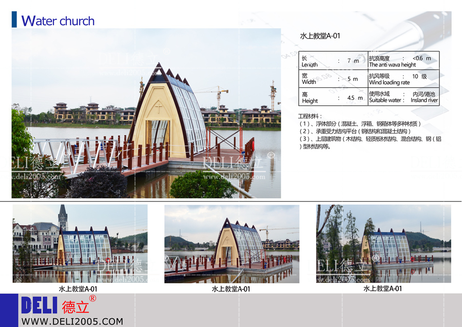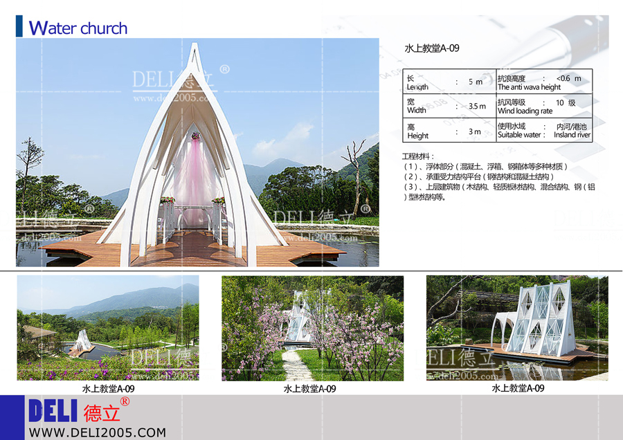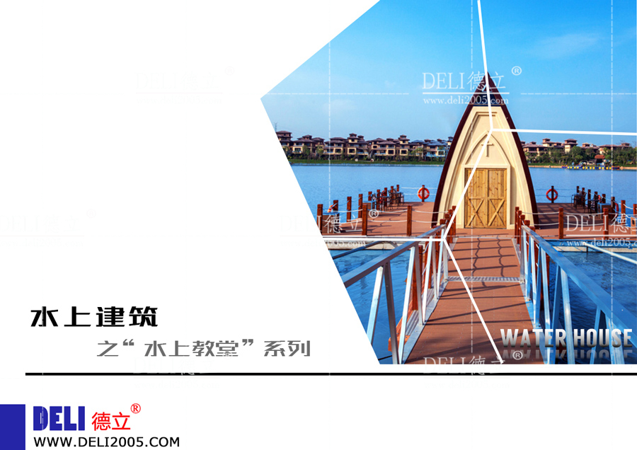 德立公司水上建筑之水上教堂系列,該系列工程以“與自然共生”為主題。在一系列教堂的設(shè)計(jì)中,思考著神圣空間。在西方,神圣空間是形而上的。然而,神圣空間與自然存在著某種聯(lián)系,而這與日本式的泛靈論或泛神論無關(guān)。自然是與原生的自然不同的。神圣所關(guān)系的是一種人造自然或建筑化的自然。當(dāng)綠化、水、光和風(fēng)根據(jù)人的意念從原生的自然中抽象出來,它們即趨向了神性。后來建造中的光的教堂表現(xiàn)的是光這種自然元素的建筑化和抽象化。專門設(shè)計(jì)的婚禮教堂,全部由清水混凝土,玻璃,鋼架材料構(gòu)成,將自然引入室內(nèi),同時(shí)又是抽象的自然,是帶有神的色彩的自然,一年四季景致不同,是女孩最向往的結(jié)婚地之一。除此之外,水上教堂也成為人們休閑娛樂開party的好去處,同樣也作為景區(qū)的一大特色,深受大眾的喜愛。在這樣的背景催化下,德立公司開發(fā)了水上教堂系列建筑,充分地利用了自身的技術(shù)優(yōu)勢(shì)。