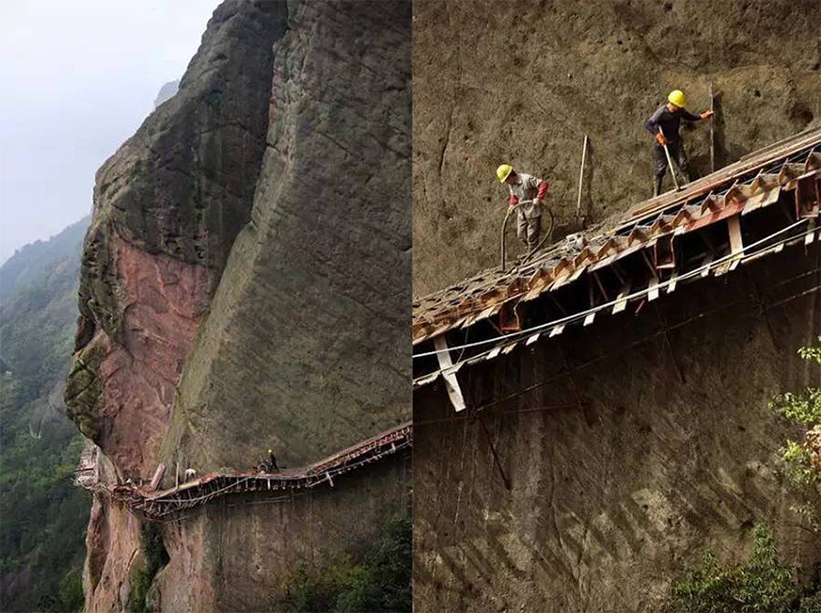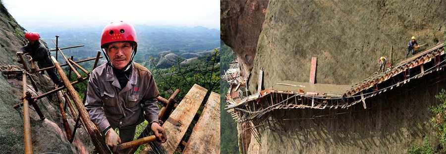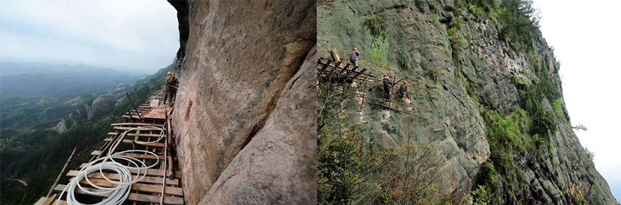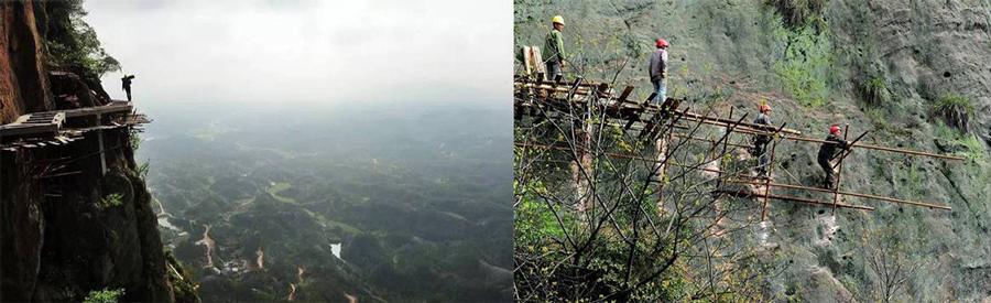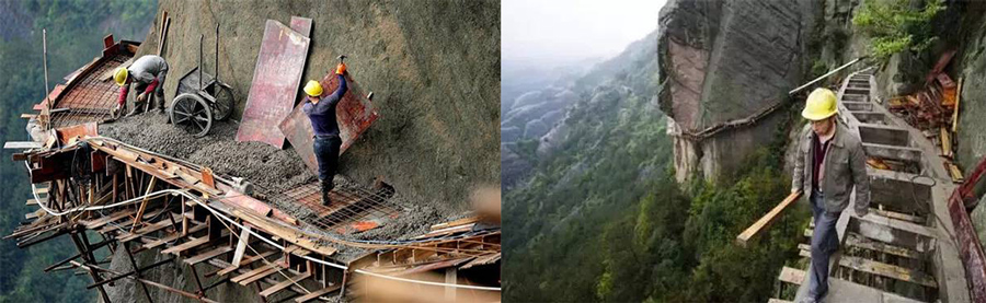 湖南平江棧道,下文的主角。但是修棧道的工人在幾百米高的懸崖上作業(yè)時(shí)卻沒安全保障,沒有安全繩,只有木板、手推車和生銹腳手架等簡(jiǎn)陋工具。這是一支來自湖南和江西的棧道施工隊(duì),一行21人。他們經(jīng)驗(yàn)極其豐富,湖南與江西等地的多個(gè)景區(qū)棧道均出自他們之手。此次在湖南平江石牛寨修建一條平均海拔高度約近400米、總長(zhǎng)度近1公里的懸崖棧道,施工難度極大。