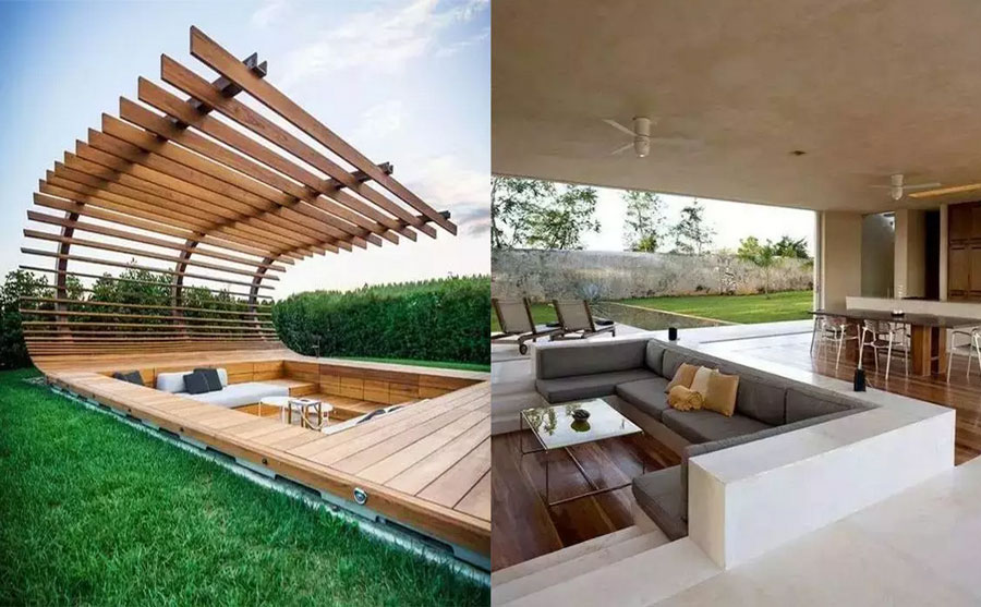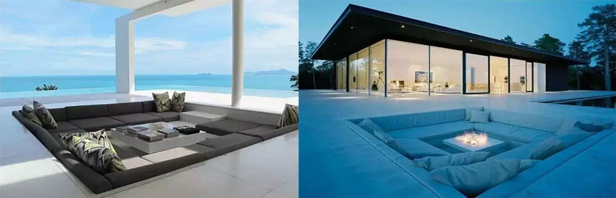 有的下沉式庭院,等于房子往外推出若干尺寸,這種做法實(shí)際上是最大限度的利用它面積的功能,而不是簡(jiǎn)單的把庭院層做成一個(gè)儲(chǔ)藏式,因?yàn)樗耆晒?,完全通透,無(wú)論做客廳也好,做燒烤區(qū)也好,功能是最大化的使用。