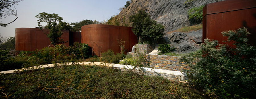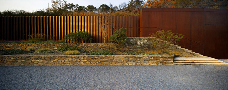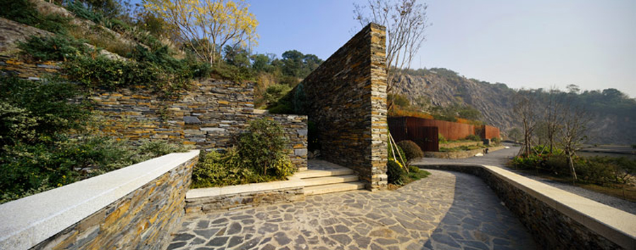 設(shè)計(jì)師選擇了同時(shí)用“加減法”應(yīng)對(duì)采石礦坑特殊形態(tài)的生態(tài)修復(fù)設(shè)計(jì)原則:采取“加法”策略通過(guò)地形重塑和增加植被來(lái)構(gòu)建新的生物群落。針對(duì)裸露的山體崖壁,設(shè)計(jì)師沒(méi)有采取常規(guī)的包裹方法,而是尊重崖壁景觀(guān)的真實(shí)性。在出于安全考慮的有效避讓前提下,設(shè)計(jì)師采取了不加干預(yù)的“減法”策略,使崖壁在雨水、陽(yáng)光等自然條件下進(jìn)行自我修復(fù)。對(duì)于存留的臺(tái)地邊緣擋土墻,設(shè)計(jì)師用銹鋼板這種帶有工業(yè)印記的材料,對(duì)其進(jìn)行包裹,形成有節(jié)奏變化和光影韻律的景觀(guān)界面。