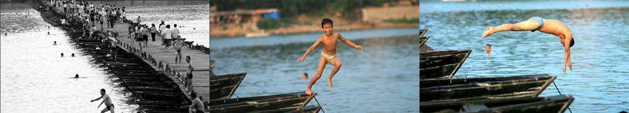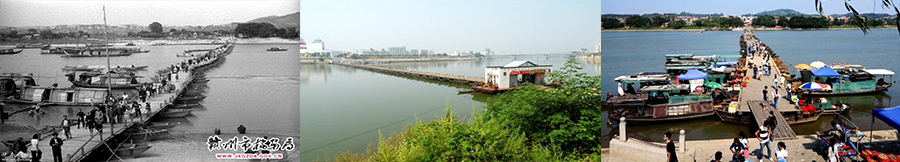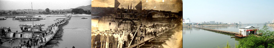 (幾十年前的建春門浮橋。1949年恢復的西津門浮橋,歷史照片。2005年恢復的營角上南河浮橋。)