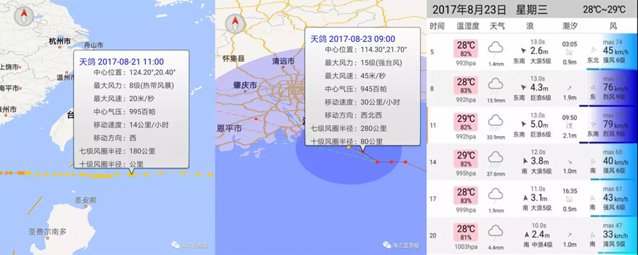 8月23號早上,小編查看了各個游艇會的海浪潮汐天氣預(yù)報,不看不知道,一看嚇一跳,惠州巽寮灣游艇會,將可能迎來6米的巨浪;而大鵬的幾個游艇會,也可能迎來5米的巨浪和大風(fēng);珠江海域的游艇會,深圳灣也有可能迎來5米巨浪,同時將有9級的烈風(fēng);而南沙游艇會與深圳機場鴻洲國際游艇會相對好點,但也將有4米左右的大浪和8級的大風(fēng);而受到正面襲擊的珠海、中山,將可能受到10級以上的狂風(fēng)襲擊。通過查看潮汐表看到,8月23日剛好是本月的大潮汛期,高潮時間將分別從10-11點之間,從對“天鴿”的預(yù)報看,臺風(fēng)將在12-13點左右,可能在珠海與陽江之間登錄,而天鴿最接近深圳的時間在11點左右,也將是高潮的時間,這對于深圳、珠海等游艇會將是一場嚴峻的考驗。