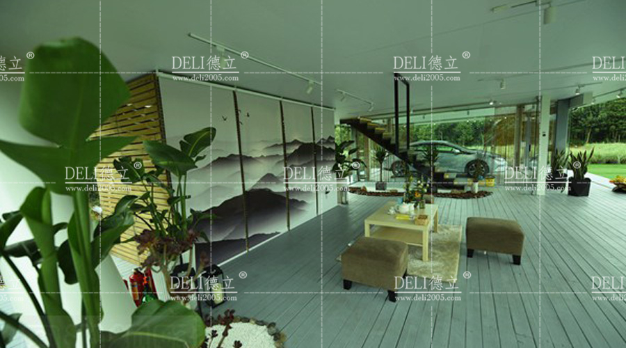 屋子分為上下兩層,一層是小花園休閑區(qū),可以用做會客區(qū)和一個可升降的車庫。 圖為一樓的小花園休閑區(qū)。