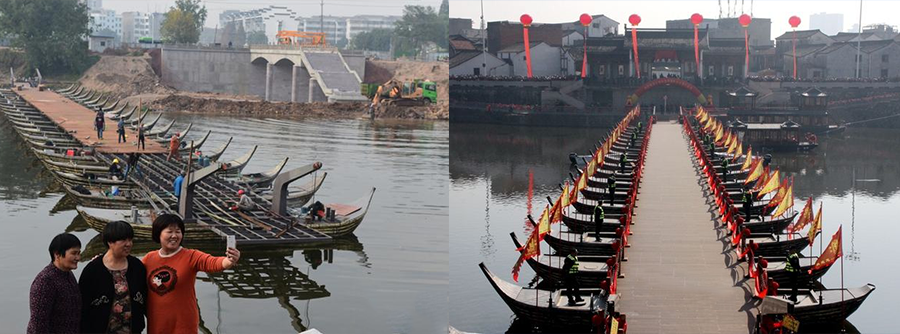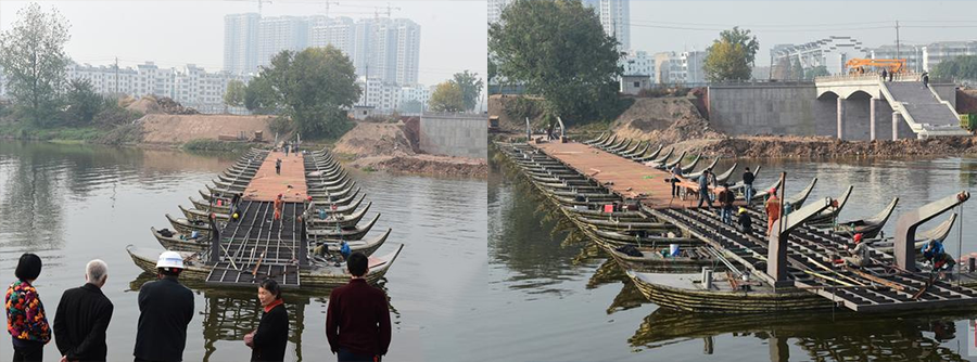 11月6日,施工人員正在修繕義烏佛堂古鎮(zhèn)的萬(wàn)善浮橋。此次重建的浮橋設(shè)計(jì)全長(zhǎng)130米、寬4.5米,由20艘浮橋船組成,用防滑、防腐的特種木材拼接,兩邊還有木欄,采用民間傳統(tǒng)工藝制作,資金全部來(lái)自民間集資。