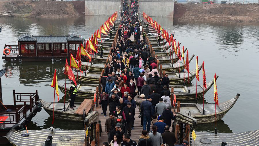 義烏市佛堂鎮(zhèn),義烏江上首座由眾多民間人士籌資重建的大橋——“萬(wàn)善浮橋”11月28日開(kāi)始恢復(fù)重建后的試通行,這里成了眾多游客游覽的熱點(diǎn)之一,紛紛有序排起了長(zhǎng)隊(duì)一一上橋,體驗(yàn)并爭(zhēng)睹芳容。重建后的浮橋,橋長(zhǎng)130米,寬4.5米,由20艘木船連接而成。一頭倚著挽瀾亭,一頭連接著江北的古民居苑,這既是游客從江北通往古鎮(zhèn)的主入口,是古鎮(zhèn)“一江兩岸三橋”規(guī)劃的核心,也是連接江南、江北的一道亮麗風(fēng)景。