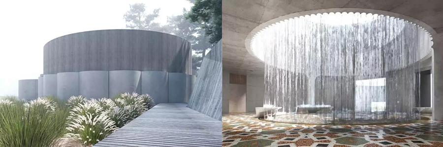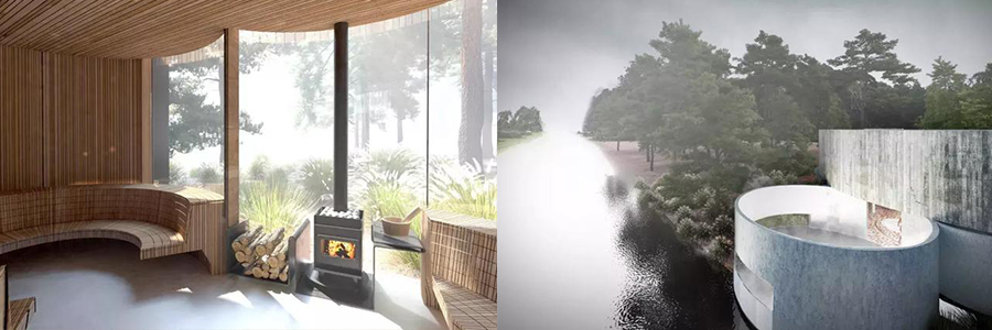 臨河客房區(qū)與休息室陽臺相互連接,延伸的橋梁橫跨潺潺清澈的溪流。該橋的另一端是溫泉區(qū),包括有桑拿房、蒸汽房和11米高的圓形造型的瀑布理療區(qū)。