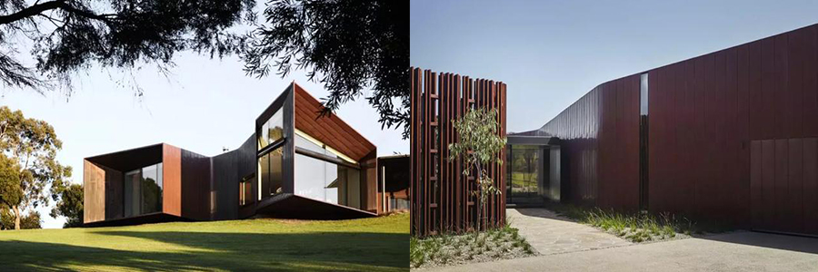 這座新房子位于斜坡上面,建筑兩端分居不同方向,分別可以看到巴斯海峽和菲利普港灣的廣闊景觀,房子兩側(cè)的銅皮結(jié)構(gòu)大氣而厚重。彎曲的木材樹籬引導訪客進入,然后進入連接現(xiàn)有空間和新空間的玻璃玄關處。室內(nèi)開敞式結(jié)構(gòu),高挑的玻璃幕墻把最美的景色,展現(xiàn)到眼前,陶制器皿擺滿層架,與后面的木屏風搭配,有著樸質(zhì)清新的氣氛。