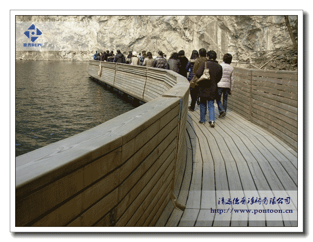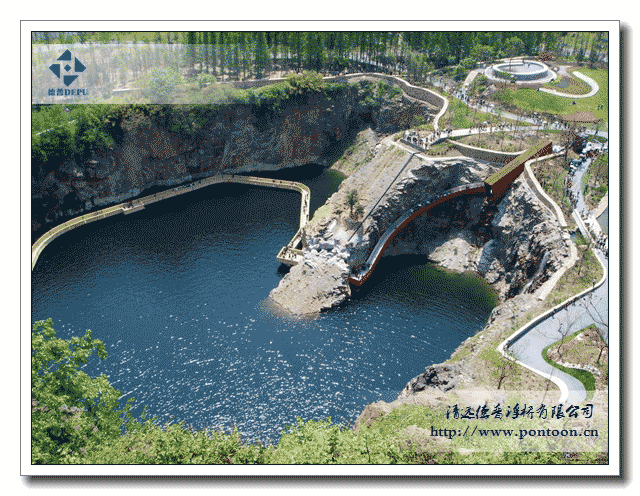 該景觀浮橋其設(shè)計(jì)、加工到現(xiàn)場施工均是是由清遠(yuǎn)德普浮橋有限公司2010完成。景觀浮橋主要由PE浮箱、受力鋼結(jié)構(gòu)、兩側(cè)護(hù)欄以及防腐木道面板組成,設(shè)計(jì)總廠約160米,寬1.54米,岸側(cè)直立性護(hù)欄搞約1.2米,弧形護(hù)欄高約1.08米,采用撐桿、交叉剛索定位及固定。浮橋首尾與一線天平臺相接,橋身順山勢曲折,四度盤轉(zhuǎn),浮瞰如盤龍浮水,十分壯觀。