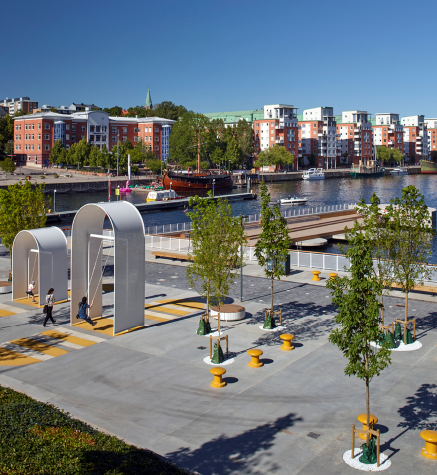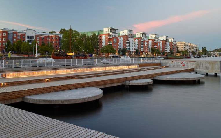 - 碼頭的功能根據(jù)港口和工業(yè)環(huán)境所需再設(shè)計(jì)。碼頭因?yàn)橛写笮突炷涟澹蓚鹘y(tǒng)的雙柱系纜樁啟發(fā)得到的亮黃色座位,和白色護(hù)欄而富有特色?;⌒卧诖a頭的設(shè)計(jì)中反復(fù)出現(xiàn),它是源于鄰近的Skans大橋上的兩座20世紀(jì)20年代的舊混凝土拱門。從西面看,它們與秋千的白色金屬拱門,木質(zhì)碼頭上的半圓形光滑混凝土板和坡道的拱形平臺(tái)相互呼應(yīng)。