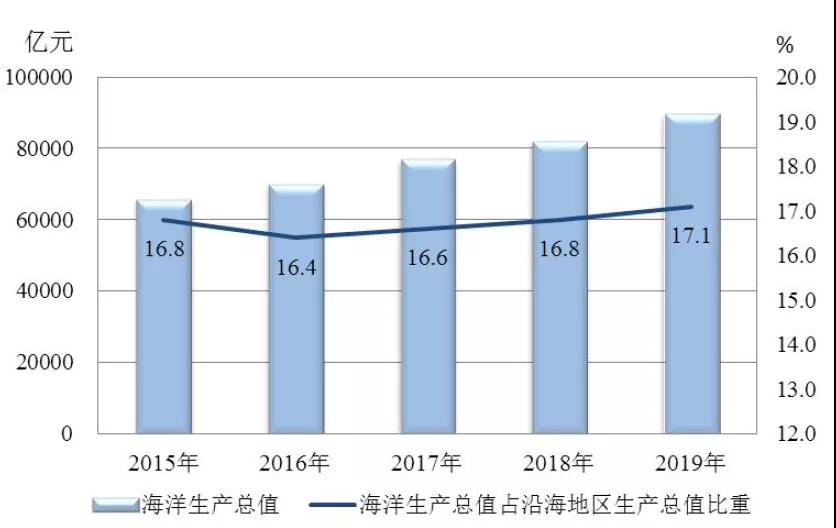 自然資源部海洋戰(zhàn)略規(guī)劃與經(jīng)濟司發(fā)布《2019年中國海洋經(jīng)濟統(tǒng)計公報》。初步核算,2019年全國海洋生產(chǎn)總值89415億元,比上年增長6.2%,海洋生產(chǎn)總值占國內(nèi)生產(chǎn)總值的比重為9.0%,占沿海地區(qū)生產(chǎn)總值的比重為17.1%。其中,海洋第一產(chǎn)業(yè)增加值3729億元,第二產(chǎn)業(yè)增加值31987億元,第三產(chǎn)業(yè)增加值53700億元,分別占海洋生產(chǎn)總值比重的4.2%、35.8%和60.0%。