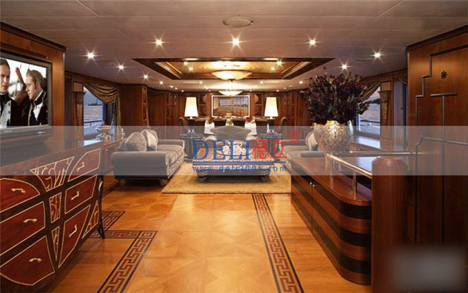 內(nèi)部客廳奢華時(shí)尚,兩側(cè)是大面積舷窗提供充足的采光,中央放有舒適的沙發(fā),造型奇特的茶幾增添一絲藝術(shù)的氣息。主臥寬敞舒適,放有一張大床,旁邊有儲(chǔ)物柜。